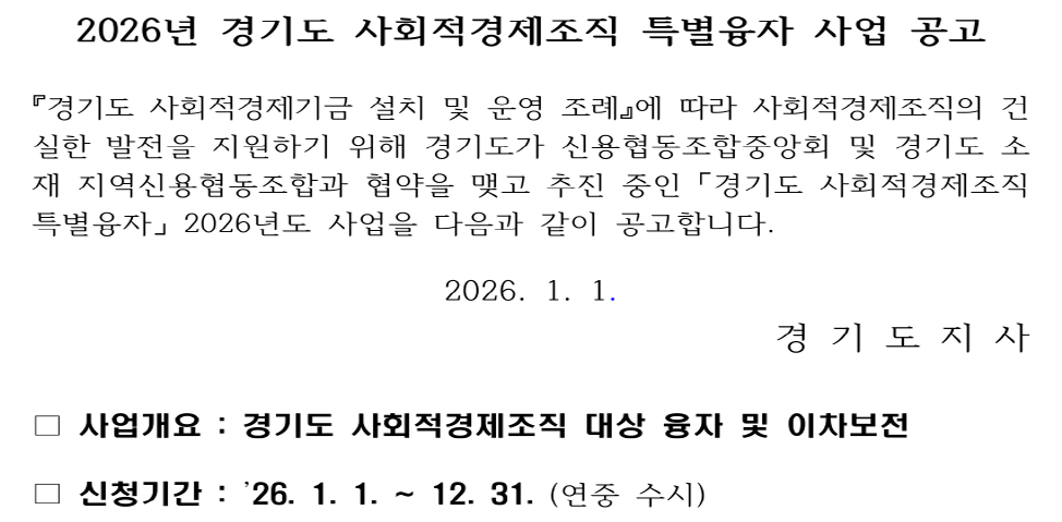 2026년 경기도 사회적경제조직 특별융자 사업